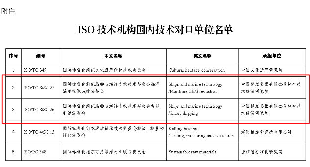 由中船綜合院承擔(dān)2個(gè)國(guó)際標(biāo)準(zhǔn)化組織(ISO)技術(shù)機(jī)構(gòu)國(guó)內(nèi)技術(shù)對(duì)口單位,分別是: