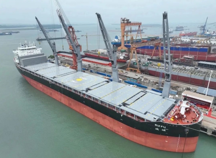 “瑞?!碧柺峭痛牡?0艘,具有裝載重大件設(shè)備貨和集裝箱式貨物的能力,首航將裝載風(fēng)電設(shè)備等貨物,并投入南非航線。