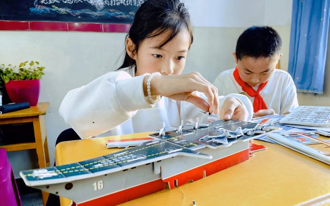 課堂特別設(shè)計(jì)趣味問答與互動實(shí)踐環(huán)節(jié)。問答環(huán)節(jié),學(xué)生們踴躍舉手搶答、主動提問;船模組裝實(shí)踐環(huán)節(jié),志愿者手把手指導(dǎo)學(xué)生對照圖紙拼接零件,當(dāng)一個(gè)個(gè)船模成型時(shí),孩子們臉上滿是收獲的喜悅,不僅直觀掌握船舶構(gòu)造原理,更在動手過程中筑牢國防意識。此次志愿服務(wù)播下的“深藍(lán)種子”,或許將在未來生根發(fā)芽一一有人可能成為海軍戰(zhàn)士、有人或許成為工程師……我們志愿路,也將沿著瀾滄江脈絡(luò),延伸向更遠(yuǎn)的遠(yuǎn)方。